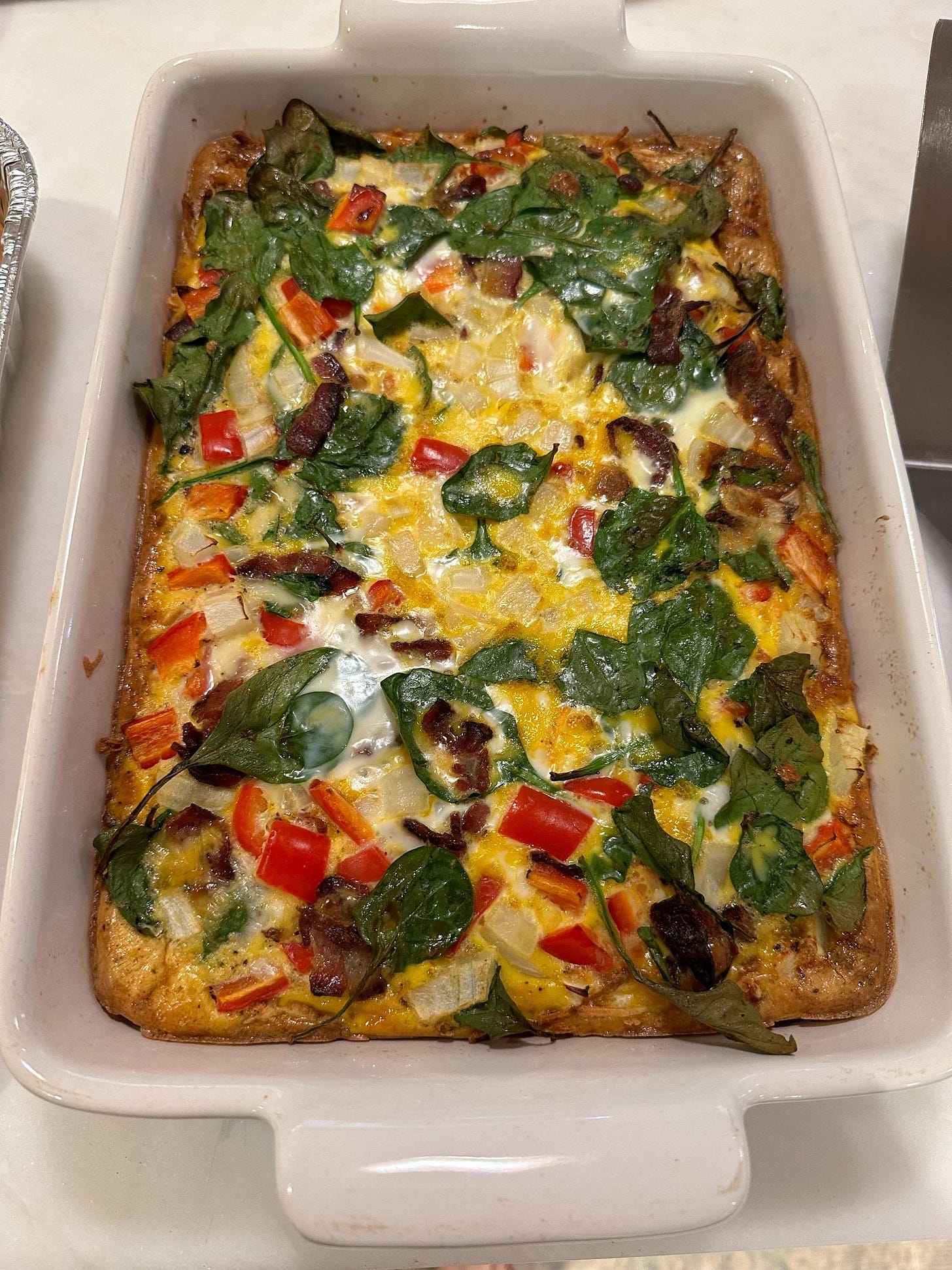 Take tater tots out of the freezer to thaw. Cook sausage in olive oil until browned. Drain and remove from the pan. Chop vegetables and set aside. Combine eggs, milk, seasonings, and whisk. Add in cheese, spinach, sausage, and chopped vegetables and mix until evenly distributed. Spray a large baking pan with cooking spray. Pour thawed tater tots into the pan and press down until the bottom and sides are covered. Bake at 350 degrees for 10 minutes. Add in egg mixture and cook for another 20-25 minutes or until the egg mixture is cooked through.