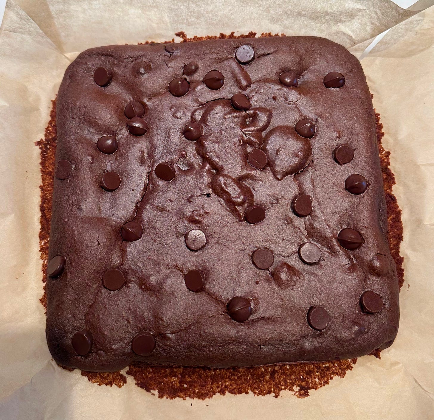Chop and boil sweet potato. Peel off skin once cooled. Add all ingredients besides the chocolate chips to a food processor or blender. Blend until smooth scraping sides halfway through. Fold in chocolate chips and pour into a lined 9x9 baking pan. Bake for 20-25 minutes at 350.